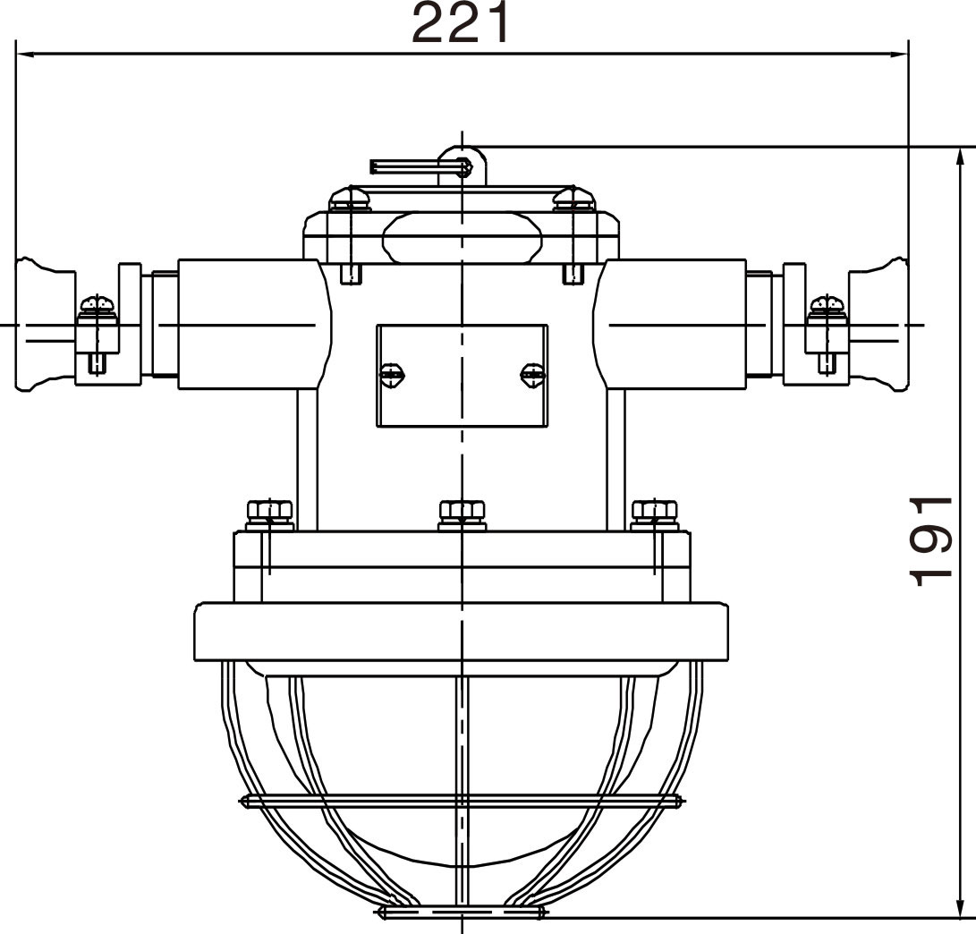 LED燈由上蓋、上殼體、下殼體、防爆透明玻璃罩、護(hù)罩等組成,上蓋與上殼體用M4螺釘連接,下殼體用M6螺釘與上殼體相連。防爆透明玻璃罩、護(hù)罩用M4螺釘固定在下殼體上。上殼體外有M4外接地螺釘、銘牌等。上殼體內(nèi)有接線板、M4內(nèi)接地螺釘、LED驅(qū)動(dòng)電源板。下殼體內(nèi)有密封墊、防爆透明玻璃罩、LED光源、散熱板。散熱板通過(guò)上殼體將光源熱量散發(fā)到燈體外。上蓋、上殼體、下殼體、防爆透明玻璃罩之間均有符合規(guī)定的隔爆接合面隔爆。